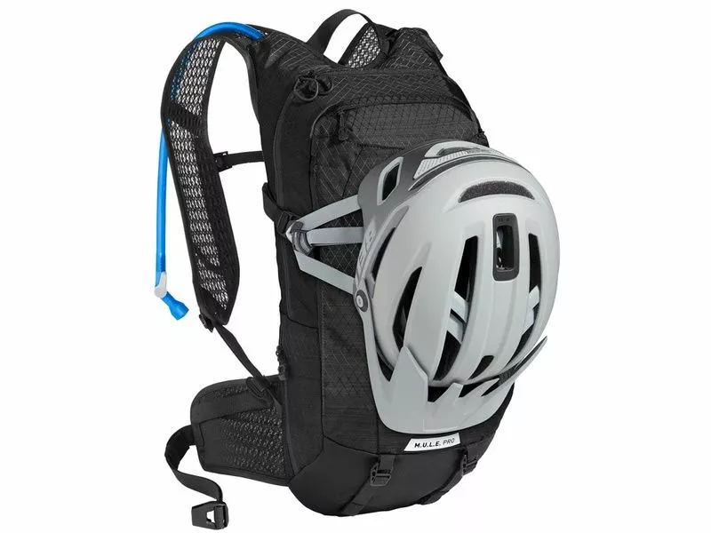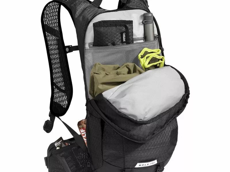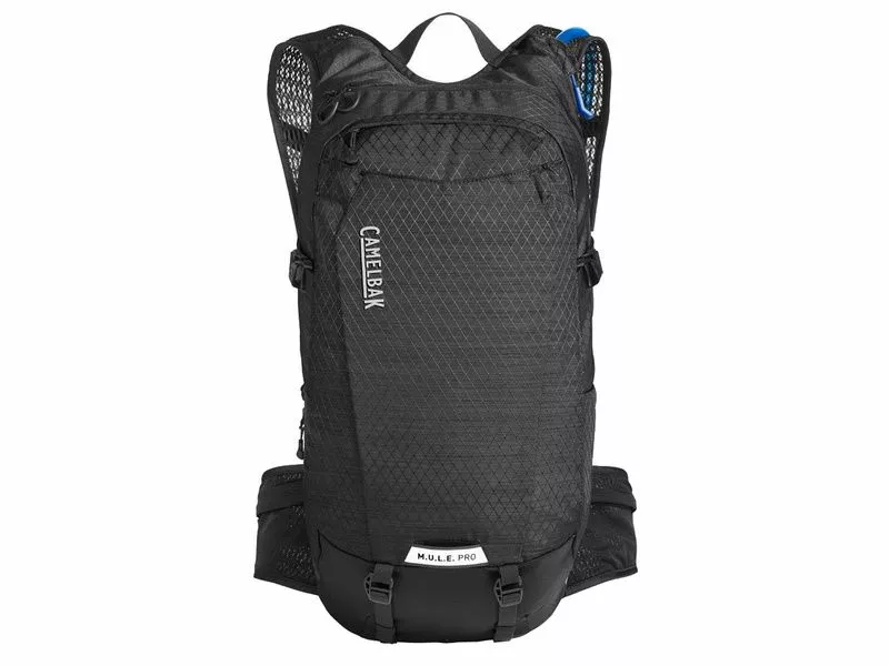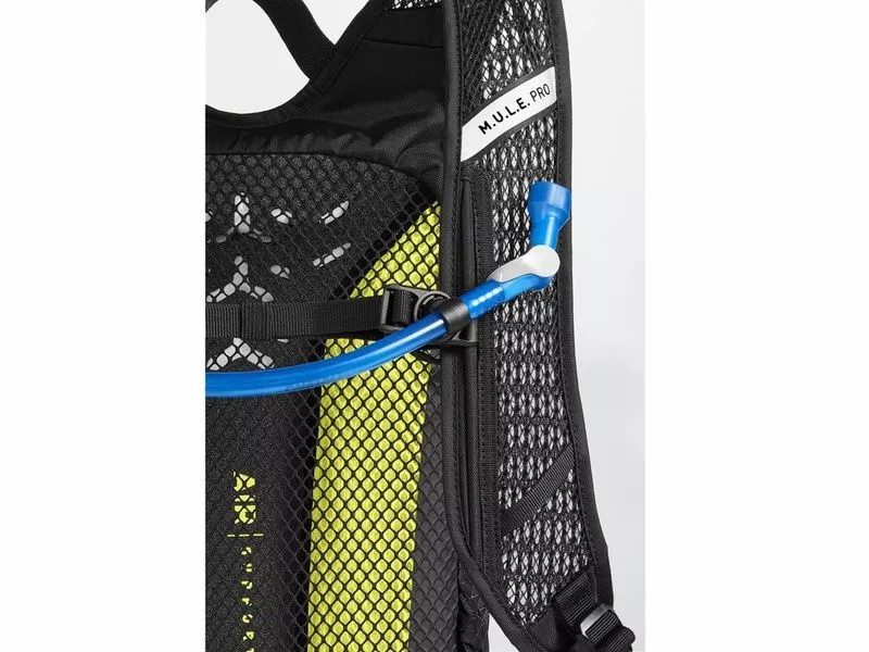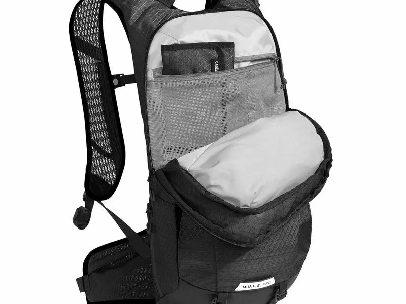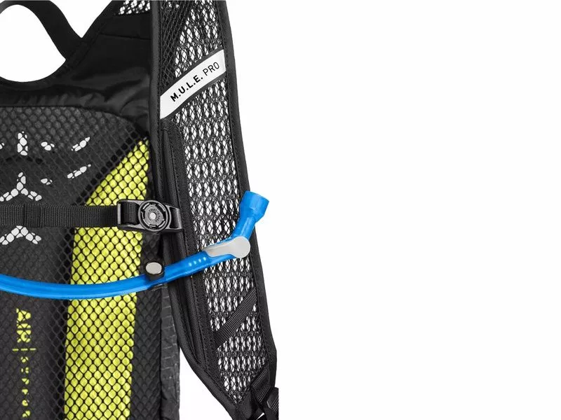 La mochila Camelbak Mule Pro 14 Negra cuenta con una espalda Air Support Pro con tecnología Body Mapping y correas en Mesh 3D que mejoran la comodidad y la respirabilidad. Es compatible con el Impact Protector que se vende separatamente y que mejora el livel de protección. Integra el nuevo depósito Crux 3L de la marca que facilita el llenado y que aumenta el flujo de agua en cada trago. Tiene varios compartimentos para herramientas, barras, llaves, e integra un sistema de ganchos para llevar el casco. El atrapatubos magnético le permite colocar el tubo para beber de vuelta en su sitio fácilmente para que pueda hidratarse sin perder la vista del camino.