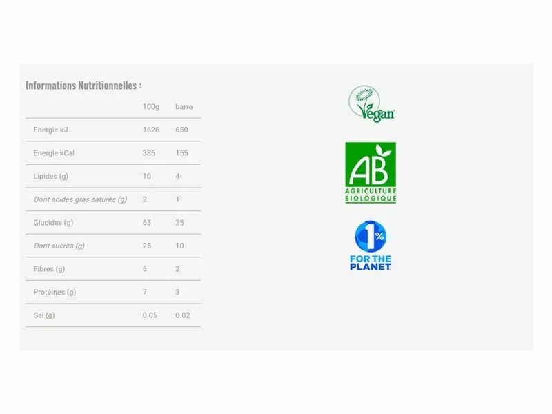 Las barritas energeticas Mulebar contienen ingredientes 100% naturales y vegan, sin conservadores y sin colorantes químicos. Esta fabricadas a partir de ingredientes Bio con verdaderos sabores de frutas, con textura suave, muiy facil de masticar e digestir gracias a la proteina vegetal. Las barritas combinan el placer y la performancia.