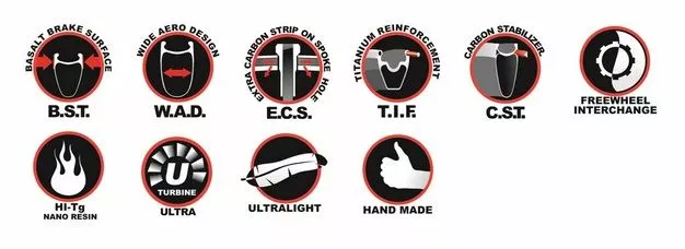 Carbono High modulus fiber con High TG Epoxy, Soporte titanio T.I.F, Banda de frenada basalto B.S.T.